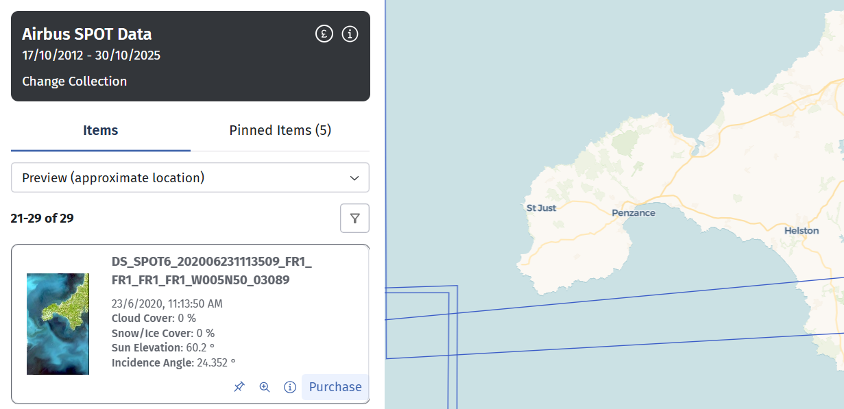 Some data thumbnails for commercial imagery provided by Airbus require the user to be logged in to their EODH account.
