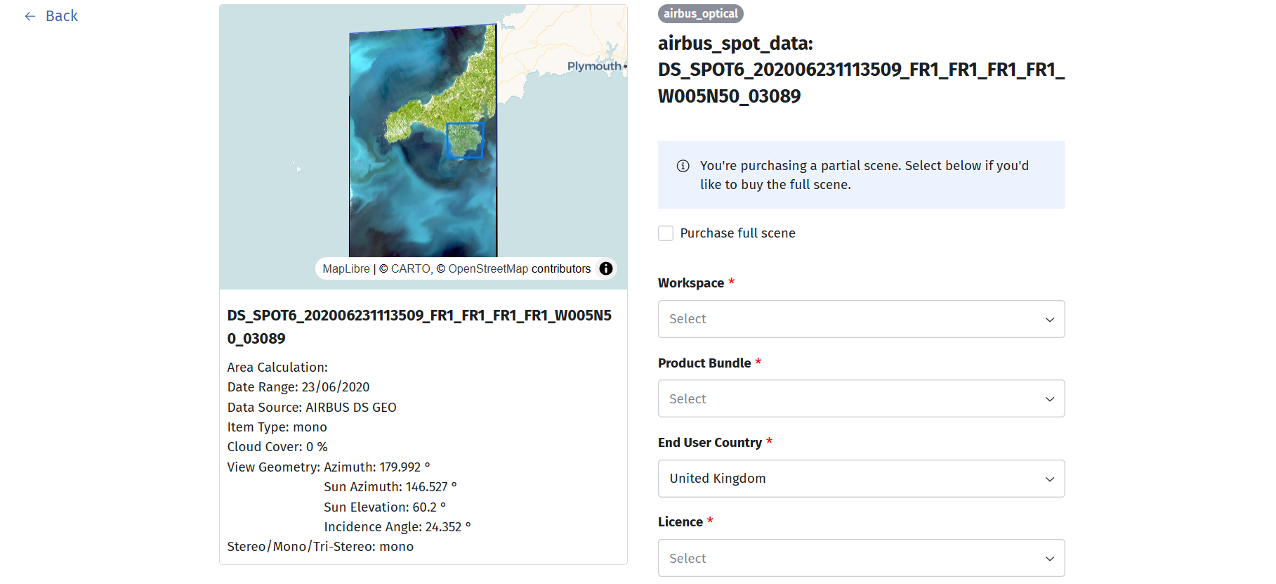 This will take you through to the ordering interface, which should look something like the image below. The available ordering fields will vary depending on the data type and the data provider. For example, a SAR data order requests additional, more specific field options. The 'Purchase full scene' checkbox will only be visible if you have drawn an AOI polygon i.e. allowing you to clip your order to the AOI which was drawn.