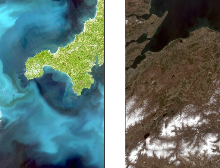 Figure: Low-resolution quicklook thumbnails for Cornwall, UK (left) and Caringorms, Scotland (right)