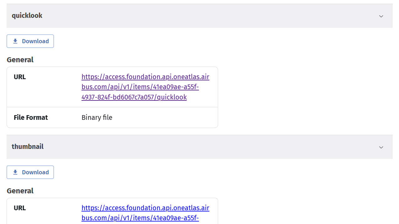 A thumbnail or quicklook is a low-resolution preview version of the commercial image, typically in JPEG or PNG format, that provides a visual summary of the full-resolution satellite data. It can be viewed prior to placing an order. It allows the user to visually check the content of the image for cloud, quality, or coverage of a specific asset, before purchasing. This allows the user to make informed purchasing decisions.