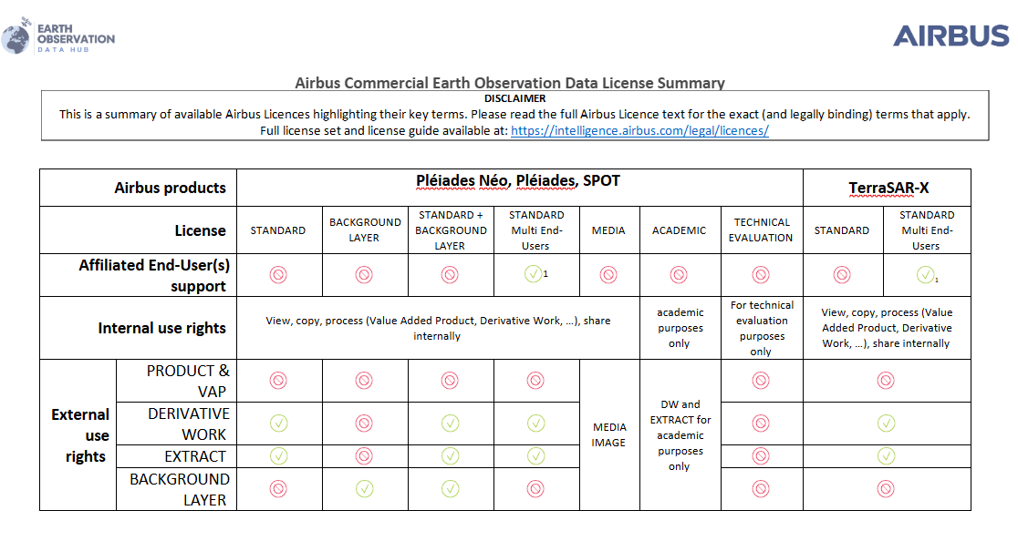 Airbus imagery is available against a comprehensive set of licenses covering a range of different use cases and industrial organisations. Airbus’ standard licence set are published on our website. See below for a one-page simplified licence matrix demonstrates the license features at a glance.