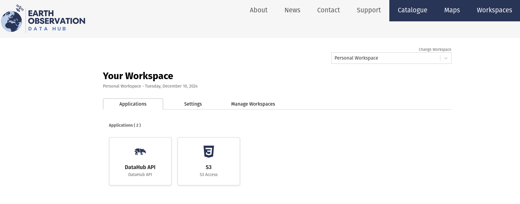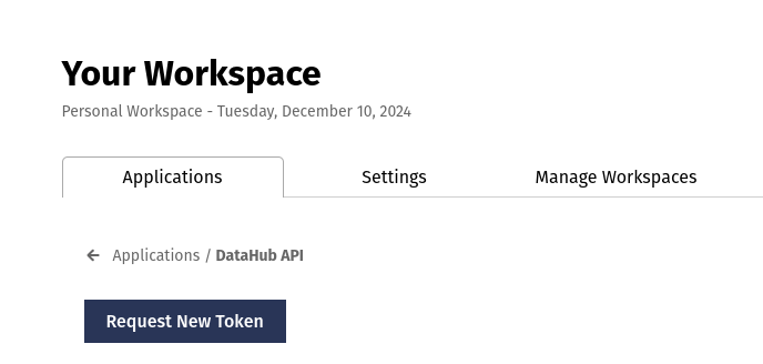 Access to the EODH platform is largely free and open. However, in order to complete tasks on the workflow runner (WR) you will require an API token. To generate the token you will require a user account whch can be requested by contacting enquiries@eodatahub.org.uk. Once you have the account, login and navigate to ‘Workspaces’. Under the ‘Applications’ tab click on the ‘DataHub’ as shown in the screenshot below. From there you will be able to generate a new API token and manage other tokens that you have access to.