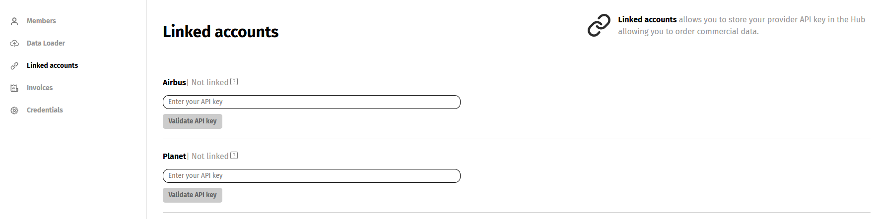 Linked accounts allow you to store your provider API key in the Hub allowing you to order commercial data within the context of a specific workspace. The platform currently supports two commercial data providers for this, namely Airbus and Planet.