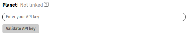 Required for accessing Planet data on the Hub. Create a Planet account, if you don't currently have one, by emailing the Planet team. Connect to the EODH using your API key, which can be found here. Input the API key under Workspaces > Linked accounts and click Link Account, as shown below. This is a one-time input.