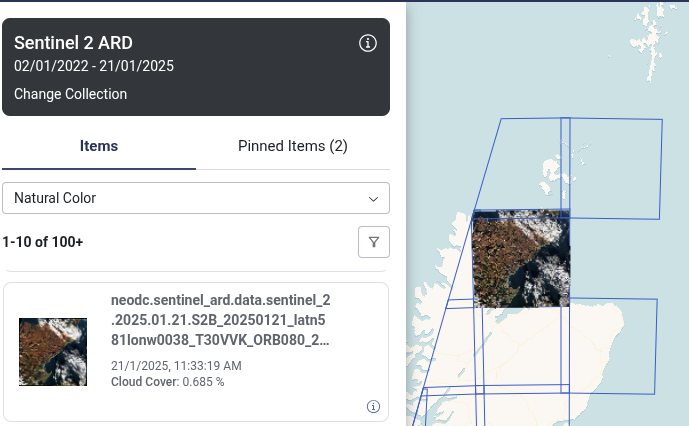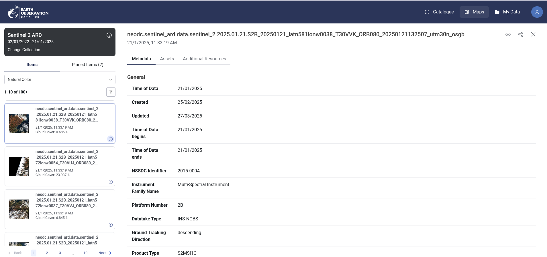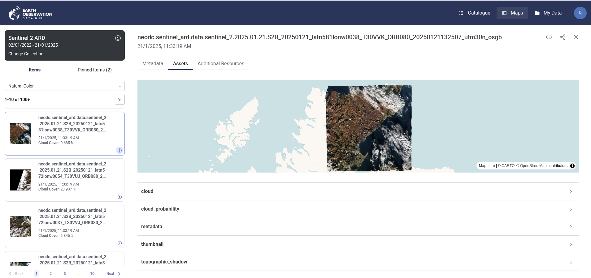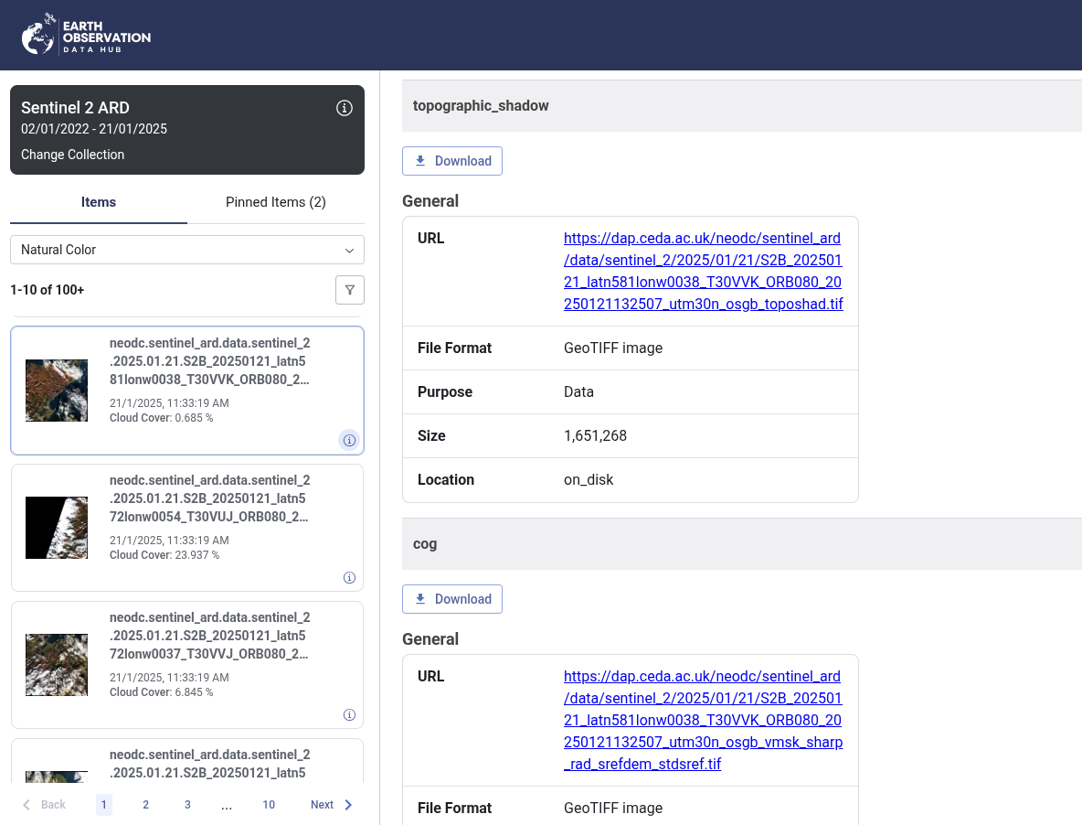 Open datasets can be downloaded from the catalogue to be used locally or imported into third-party software. Commercial data can be downloaded, once an order has been placed, from the My Data area. More information on this can be found here. Following the steps below for commercial data collections will allow you to download a thumbnail of the image, at a lower resolution and quality compared to the image product, to carry out a visual assessment before purchasing the data.