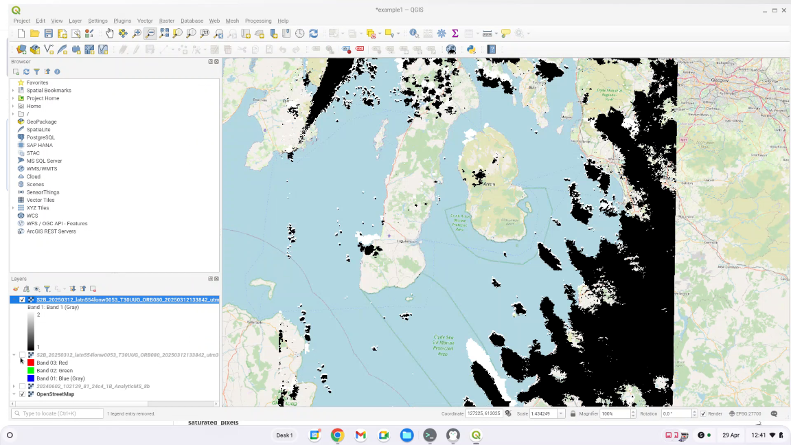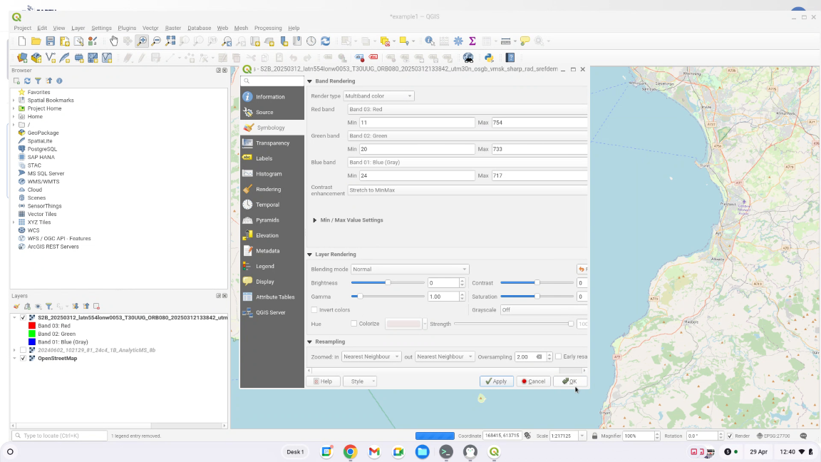 After adding the layer, you may need to adjust the band assignments for proper visualization: