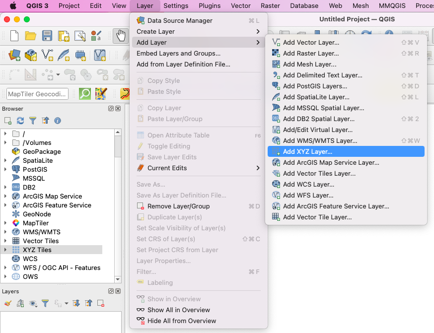In QGIS, navigate to Layer -> Add Layer -> Add XYZ Layer.